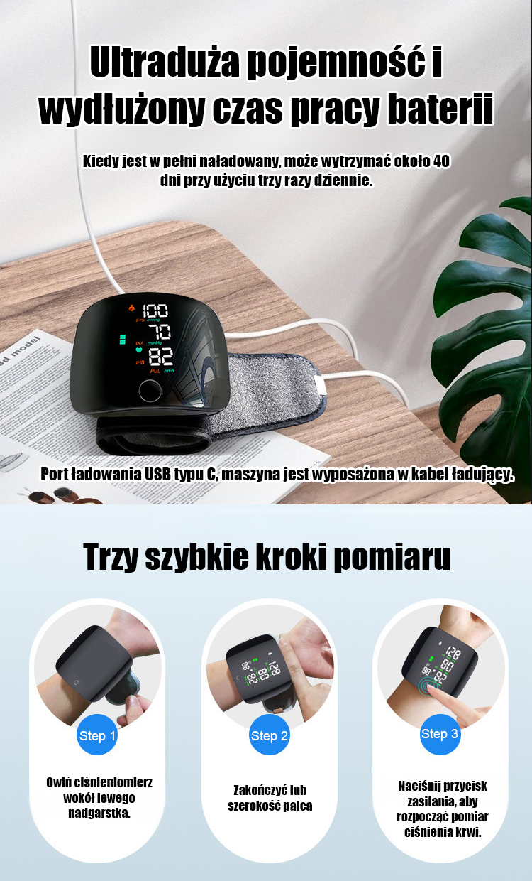 🎤 Pełne wsparcie głosowe podczas pomiarów, wyposażone w duży ekran o przekątnej 2,55 cala i trójkolorową lampkę sygnalizacyjną, idealnie spełnia potrzeby osób z wadami wzroku. 🔋 Po pełnym naładowaniu działa aż do 60 dni! 🌐 Waży jedynie 225 gramów, jest lekkie i łatwe do przenoszenia, wyposażone w poręczną torbę, umożliwiającą wygodne pomiary wszędzie tam, gdzie jesteś – doskonałe zarówno do użytku domowego, jak i w podróży!
